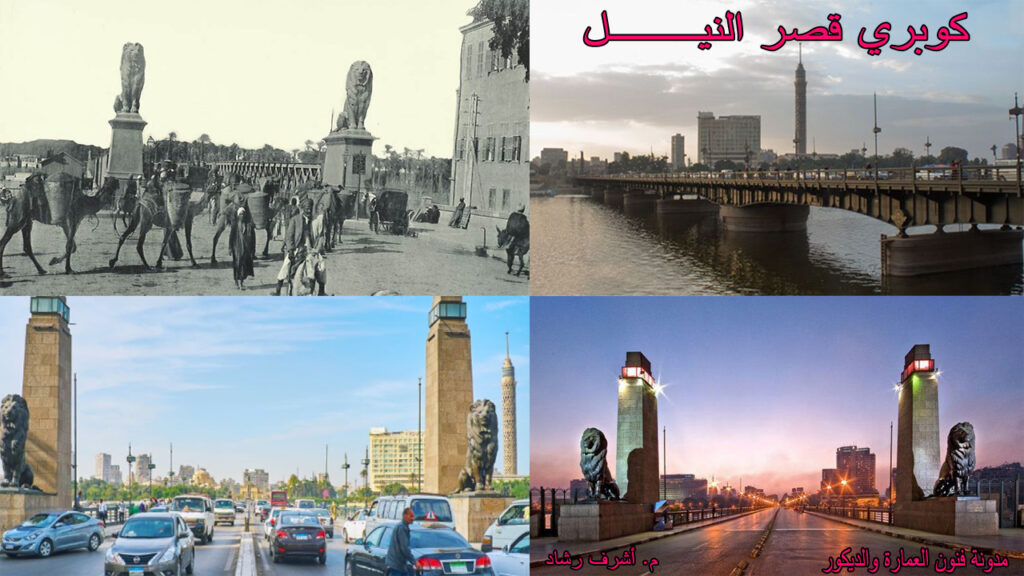 كوبري قصر النيل: حاول الخديوي إسماعيل بجعل مصر باريس الشرق، ووضع أسس تحويل القاهرة إلى مدينة حديثة تصاحب افتتاح قناة السويس في عام 1869م، وبدأت قصة إنشاء الكوبرى مع تفكير الخديوي إسماعيل فى إنشاء جسر يربط بين ميدان الإسماعيلية “التحرير حاليًا” والضفة الغربية من النيل بمنطقة الجزيرة، وبدأ العمل فى إنشاء الكوبرى عام 1869م، واستمر بناء الكوبرى 3 سنوات حتى منتصف عام 1871، بتكلفة 113.850 جنيه مصري، وبلغ طـوله 406 أمتار، وعرضه 10.5 متر، وكان الكوبرى مكوناً من 8 أجزاء منها جزء متحرك من ناحية ميدان التحرير طوله 64 متراً لعبور المراكب والسفن، ويتم فتحه يدوياً من خلال تروس، علاوة على جزأين نهائيين بطول 46 متراً، و5 أجزاء متوسطة بلغ طول كل منها 50 متراً، وتم تأسيس دعائم الكوبرى من “الدبش” المحاط بطبقة من الحجر الجيرى الصلب، كما تم تنفيذ الأساسات بطريقة الهواء المضغوط، وصممت فتحات الكوبرى كى يمكنها حمل 40 طناً، والسماح بعبور عربات متتابعة وزن كل منها 6 أطنان، وبلغ ارتفاع جسم الكوبرى عن سطح النيل حوالى 10 أمتار، تحسباً لفيضان النيل، بالإضافة إلى وضع 4 أسود من البرونز تم تصنيعها خصيصاً فى فرنسا ونقلت للقاهرة.