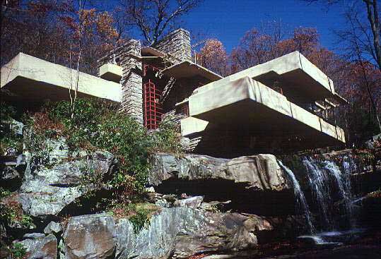اشتهر رايت بتمرده على أسلوب العمارة الكلاسيكية وميله إلى التجدد واستطاع رايت في ” بيت كاوفمان ” الريفي والذي يسمي ببيت الشلال– في بنسلفانيا 1936 أن يحقق كثيراً من أفكاره ومنها الخروج عن إطار البيت الصندوق المحاط بأربعة جدران باستخدام شرفات مفتوحة تعمل بنظام الكابولي بحيث تعطي انطباع كأنها معلقة في الهواء فوق الشلال ونابتة من كتلة الصخور المجاورة واستطاع رايت أن يوظف عناصر الطبيعة كمصبات شلال الماء وينسج مع عناصره المعمارية لوحة فنية تمتع الناظربحيث نرى سقوط الماء وانسيابه بين جدران المنزل وفتحاته وكأن المنزل مسقط الماء ويضيف جمالا أخر إلى جمال المنظر الطبيعي، بتلاحم استخدام الحجر المستخرج من ألاماكن القريبة من موقع البيت في إكساء الجدران وتغليفها على إيقاع أشكال طبقات صخور الأحجار المطلة على النهر ومن أعمالة أيضا: