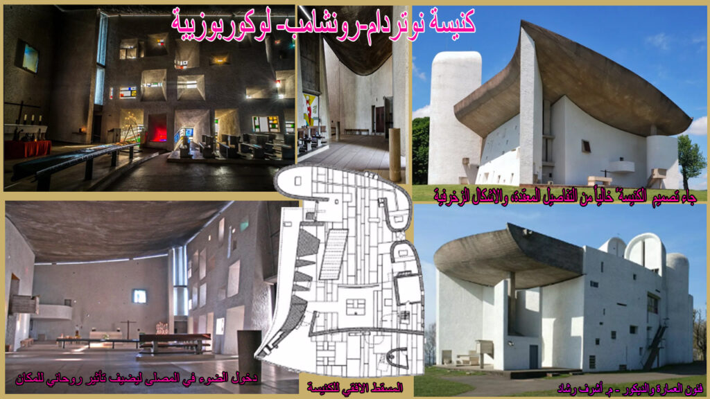 كنيسة نوتردام- في قرية رونشامب: تقع جنوب شرق مدينة باريس، وتم تكليف لوكوربوزييه بتصميمها عام 1950، لاستبدال الكنيسة السابقة التي تم تدميرها خلال الحرب العالمية الثانية،وتقع الكنيسة على قمة تل، مما يعطيها أهمية ومهابة، وقد أرادت الكنيسة تصميماً خالياً من التفاصيل المعقدة، والاشكال الزخرفية الدينية، وقد تأثر لوكوربوزييه بأفكار المدرسة التعبيرية في هذا المشروع، حيث اراد خلق فضاء يبعث على التأمل ويعكس الغرض منه، فاستلهم الشكل من البيئة المحيطة حيث يقول: “في يونيو 1950 قضيت 3 ساعات لكي أتعايش مع موقع التل الذي بنيت عليه الكنيسة .. وبينما الفكرة تدور في عقلي رسمت أربعة خطوط مستوحاة من الأفق المحيط بي في أربعة اتجاهات، كانت هي المكون الأساسي لفكرة مسقط الكنيسة“، وجاءت الجدران بيضاء ناصعة، يعزز الاجواء التأملية دخول الضوء في المصلى ليضيف تأثيره التدريجي لهذه الجدران التي تخلق أحاسيس قوية للمستخدمين تتناغم مع النشاط الديني للمكان.